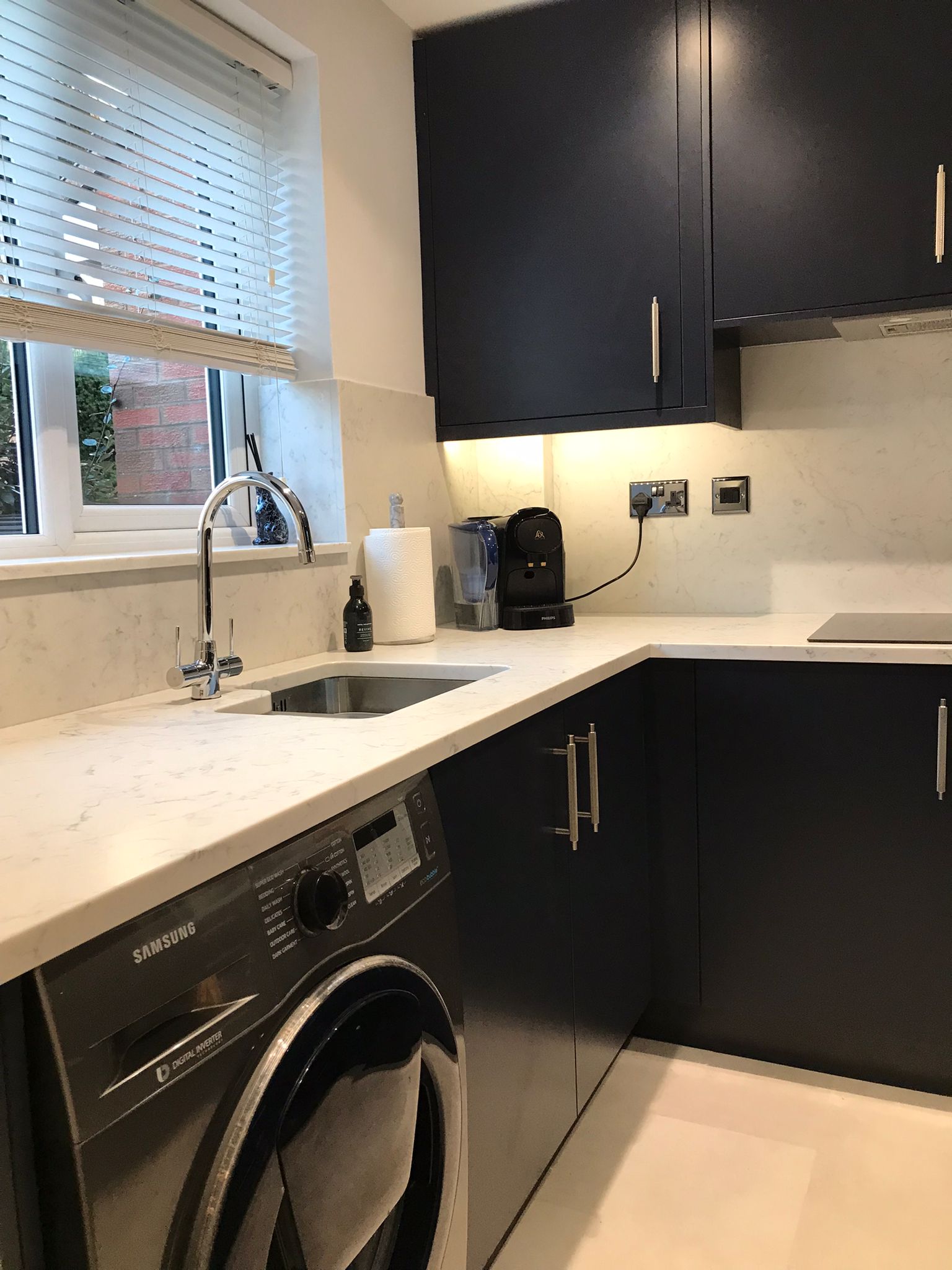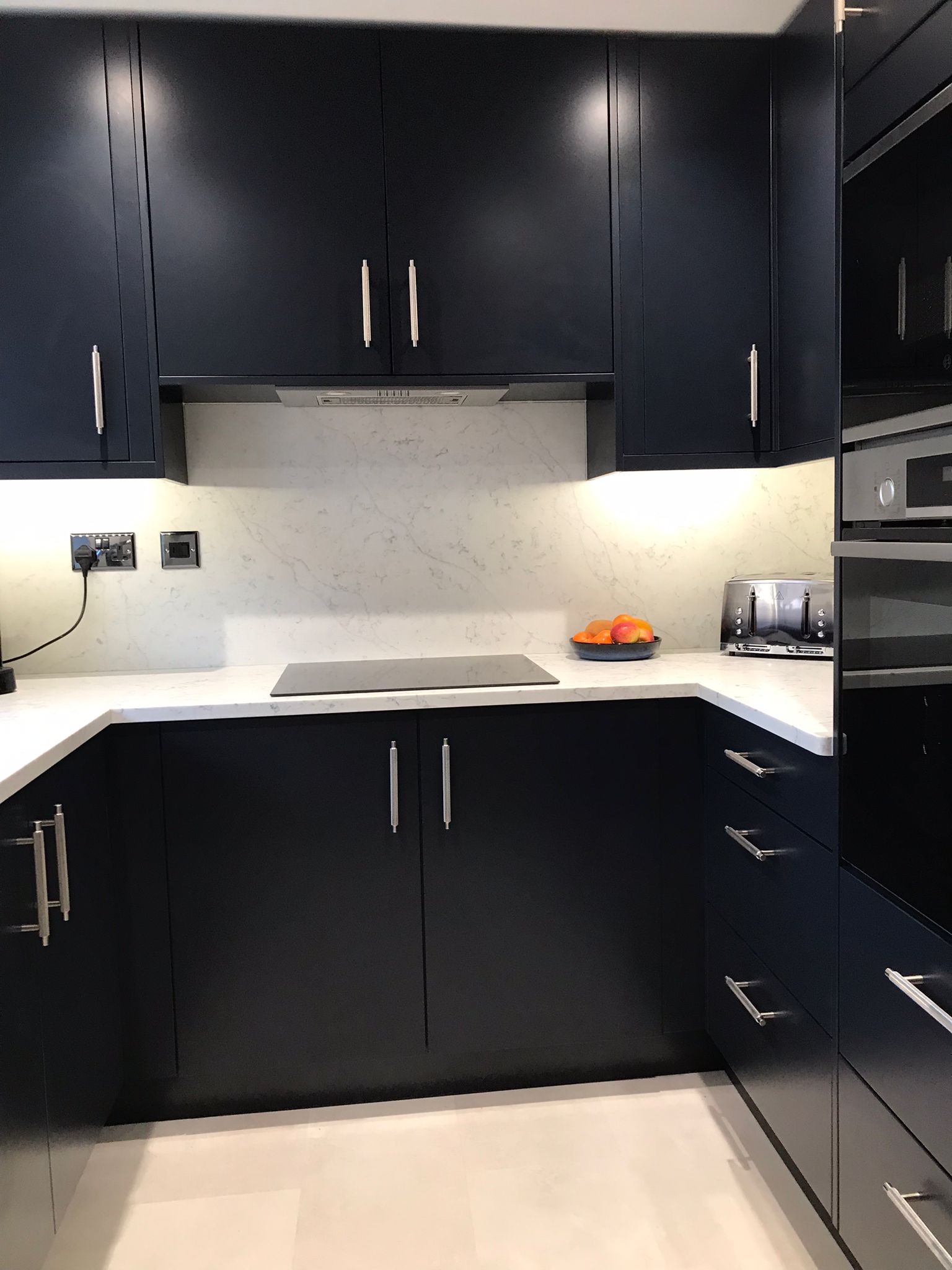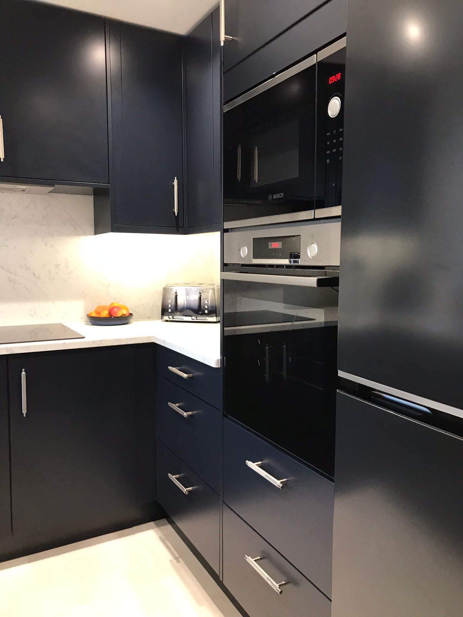 Painted Indigo Kitchen with Bosch Appliances and Amitco Flooring